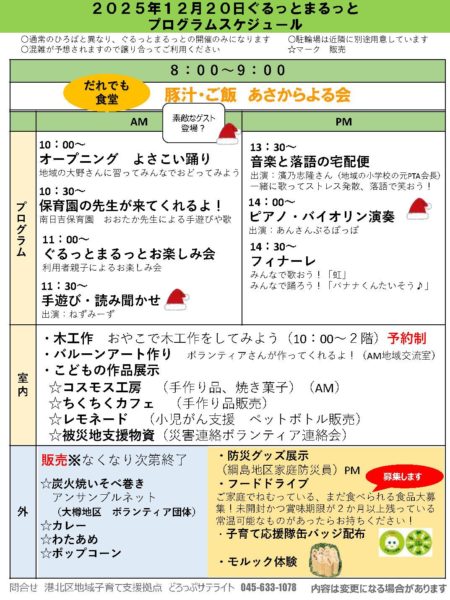 | 主催・共催 | 協力) 綱島地区家庭防災員連絡協議会、 神奈川法人会綱島支部、 南日吉保育園、港北区障害者地域活動ホームしもだ、城南信用金庫綱島支店、 地域活動支援センター作業所型 ぱんぱかパン、アンサンブルネット、たからや、三晶サービス株式会社、綱島東地区、区内の有志の皆さま |