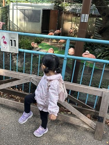 フラミンゴのところでは、遠足と思われる小学校低学年の団体がフラミンゴポーズで写真撮影をしているという微笑ましい光景に遭遇しました。私たち編集メンバーの子どもも真似してポーズ♪色々な楽しみ方があるなぁと感じます。