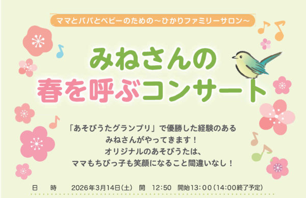 ママとパパとベビーのためのひかりファミリーサロン 【みねさんの春を呼ぶコンサート】 「あそびうたグランプリ」で優勝した経験のあるみねさんがやってきます!オリジナ […]