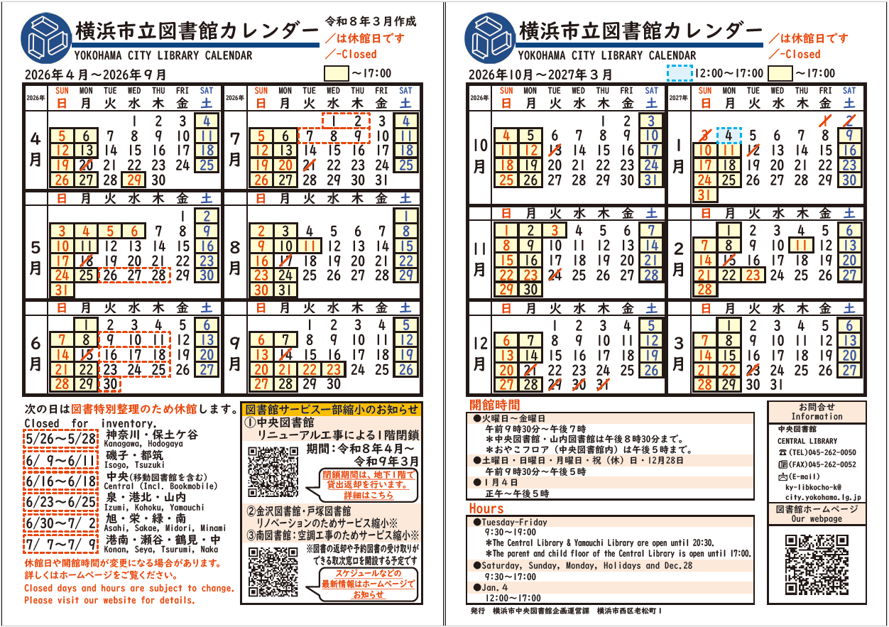 【港北図書館】休館日のお知らせ(4月・5月) 2026/04/01 行政より 【港北図書館4月・5月の休館日】 4月20日(月)・5月18日(月)港北図書館ホームーページはこちら横浜市立図書館の開館時間・休館日はこちら